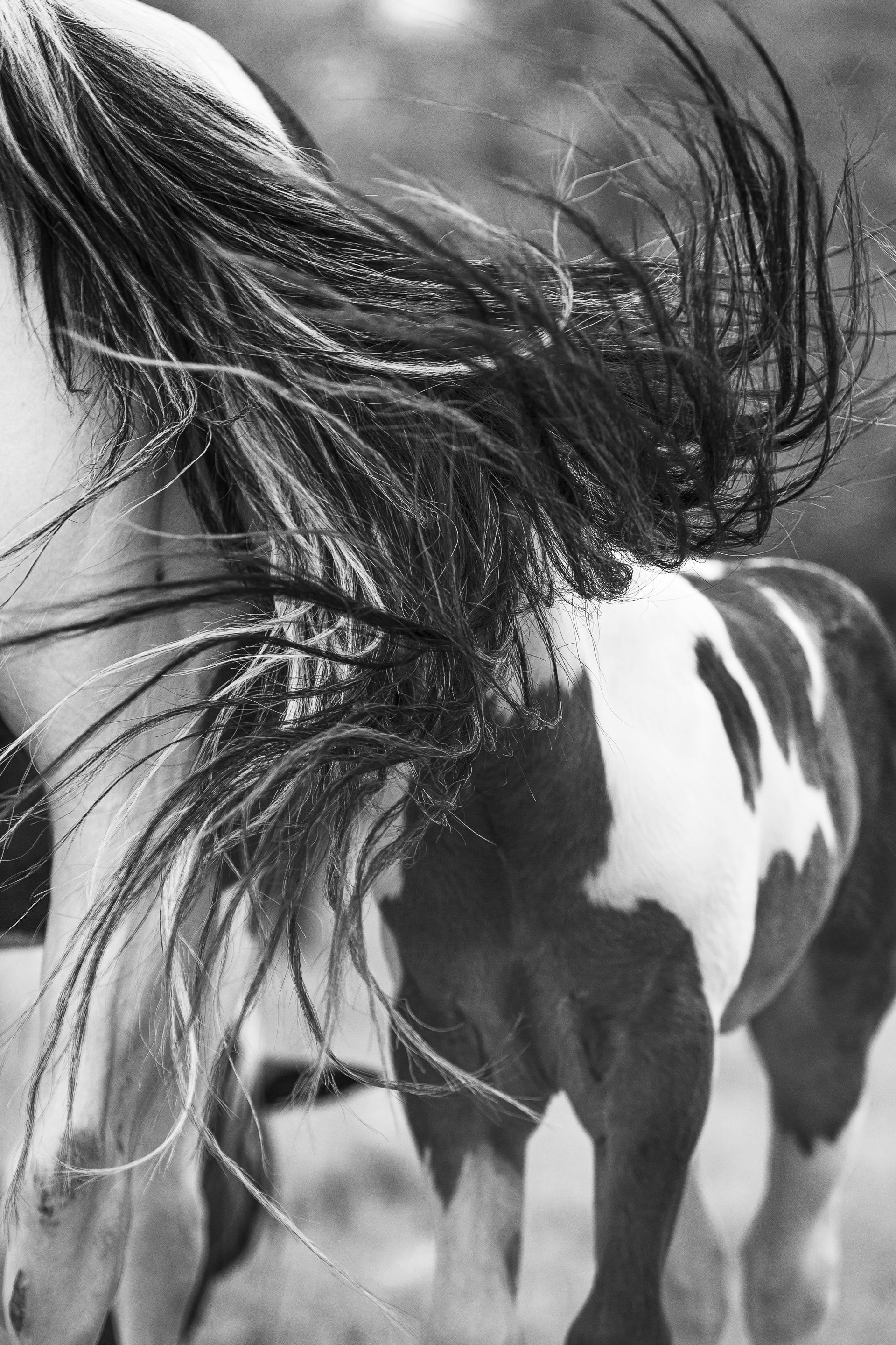The foal watches me intermittently, in time with the swaying of his mother’s tail. Photographed in France, in 2020.