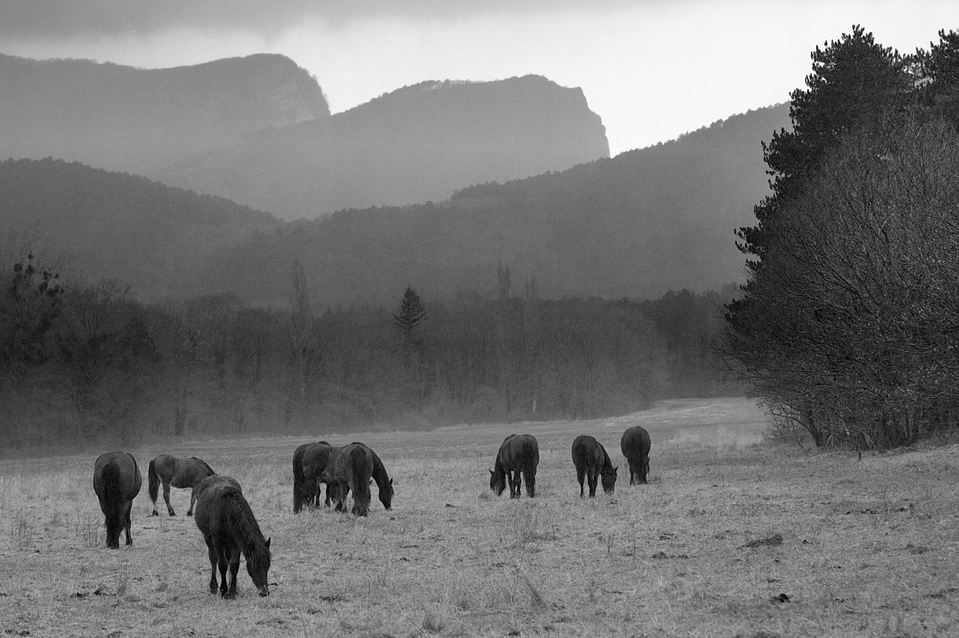 These horses from the Vercors leave their high pastures to spend the winter at lower altitudes, in the Saou Forest. It is also an opportunity for the walker crossing this landscape to encounter this little-known breed. Photographed in France, in 2015.